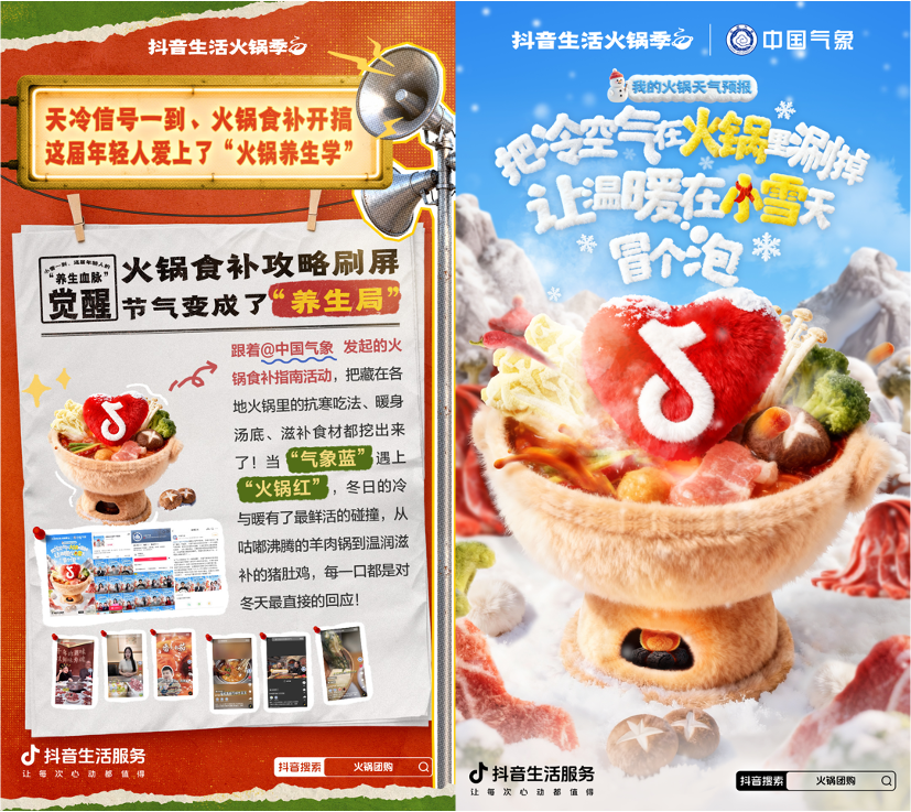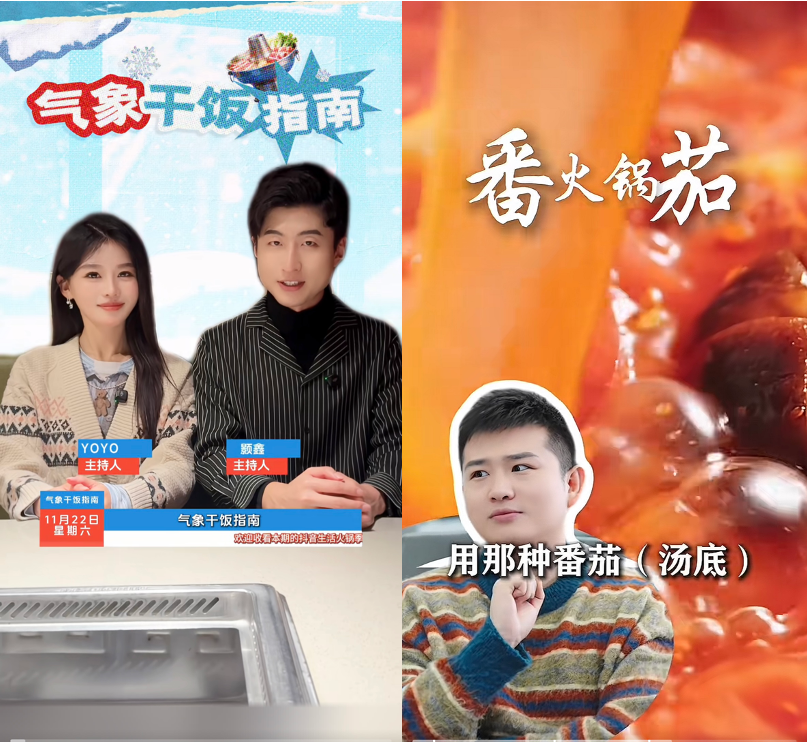 除了明星代言人的「入火」邀请,抖音生活服务还跨界联合了中国气象给大家加点「科学」动力,通过发布天气食饮系列科普,联动达人 @主持人 yoyo 酱 发布「气象干饭指南」,教大家解锁火锅的更多「抗寒吃法」。除了实用的吃法攻略,各地提供的特色「暖胃」选择当然也不能少。#小雪到了该开始续火锅了 话题下,@河北天气 @广东天气 @浙江天气 等多个气象局也陆续开启「安利」,不仅纷纷晒出当地火锅「馋哭了」网友,还通过科普饮食习俗掀起了一波「火锅养生学」热潮。