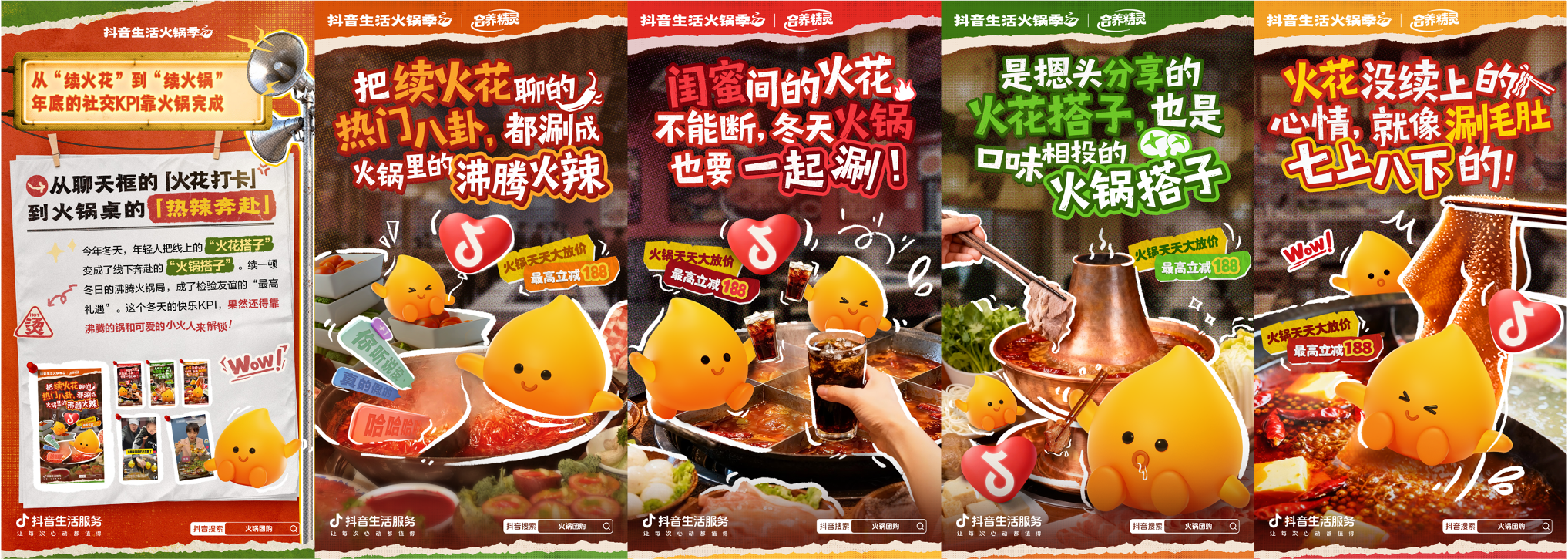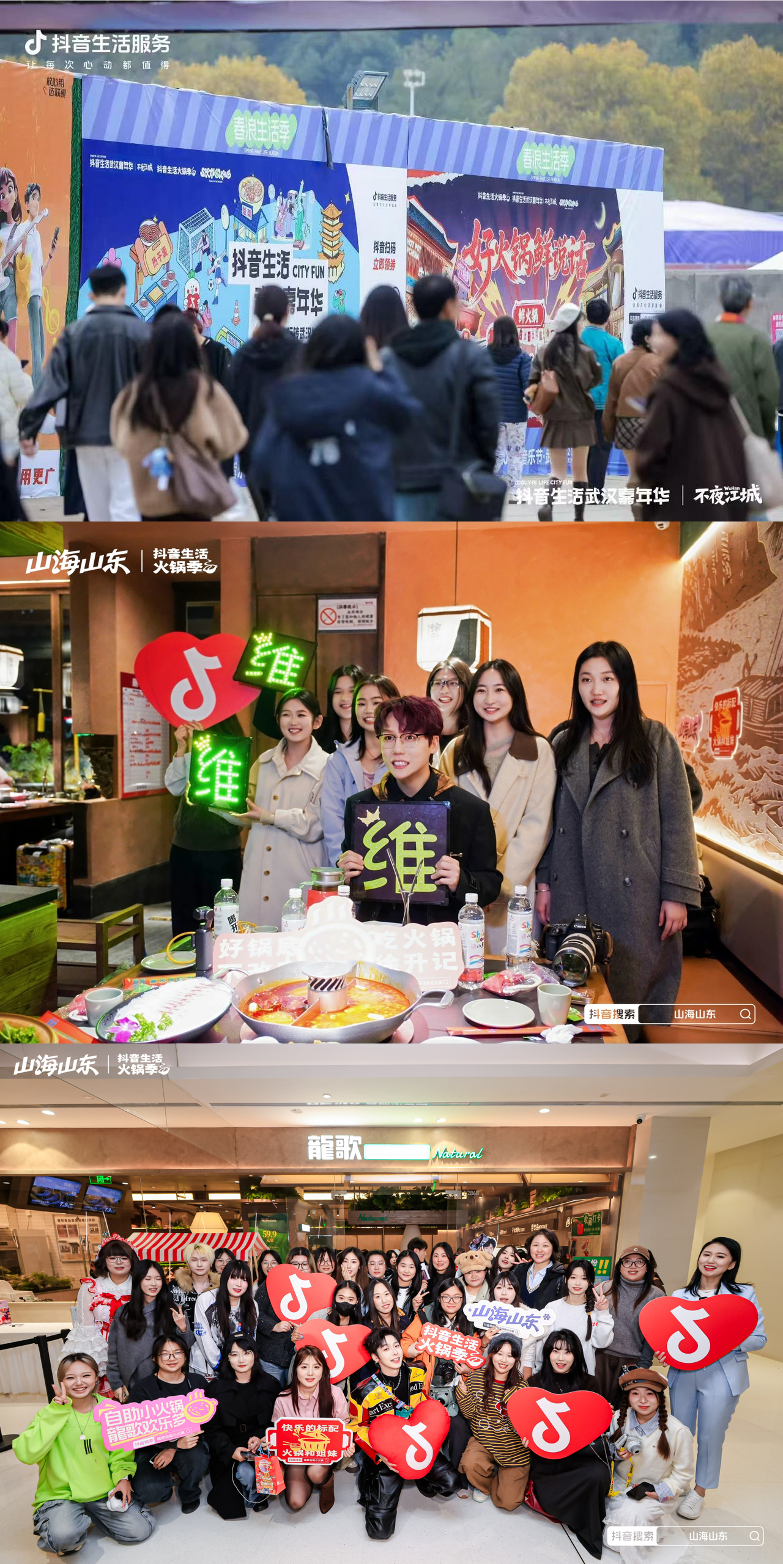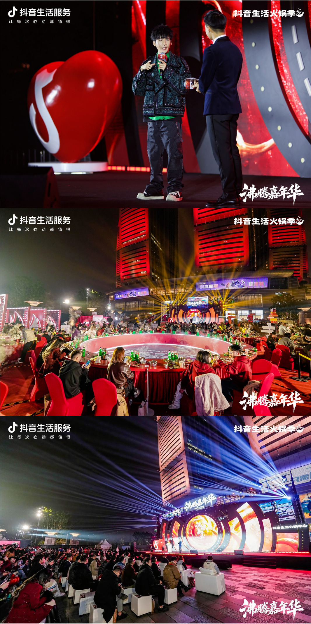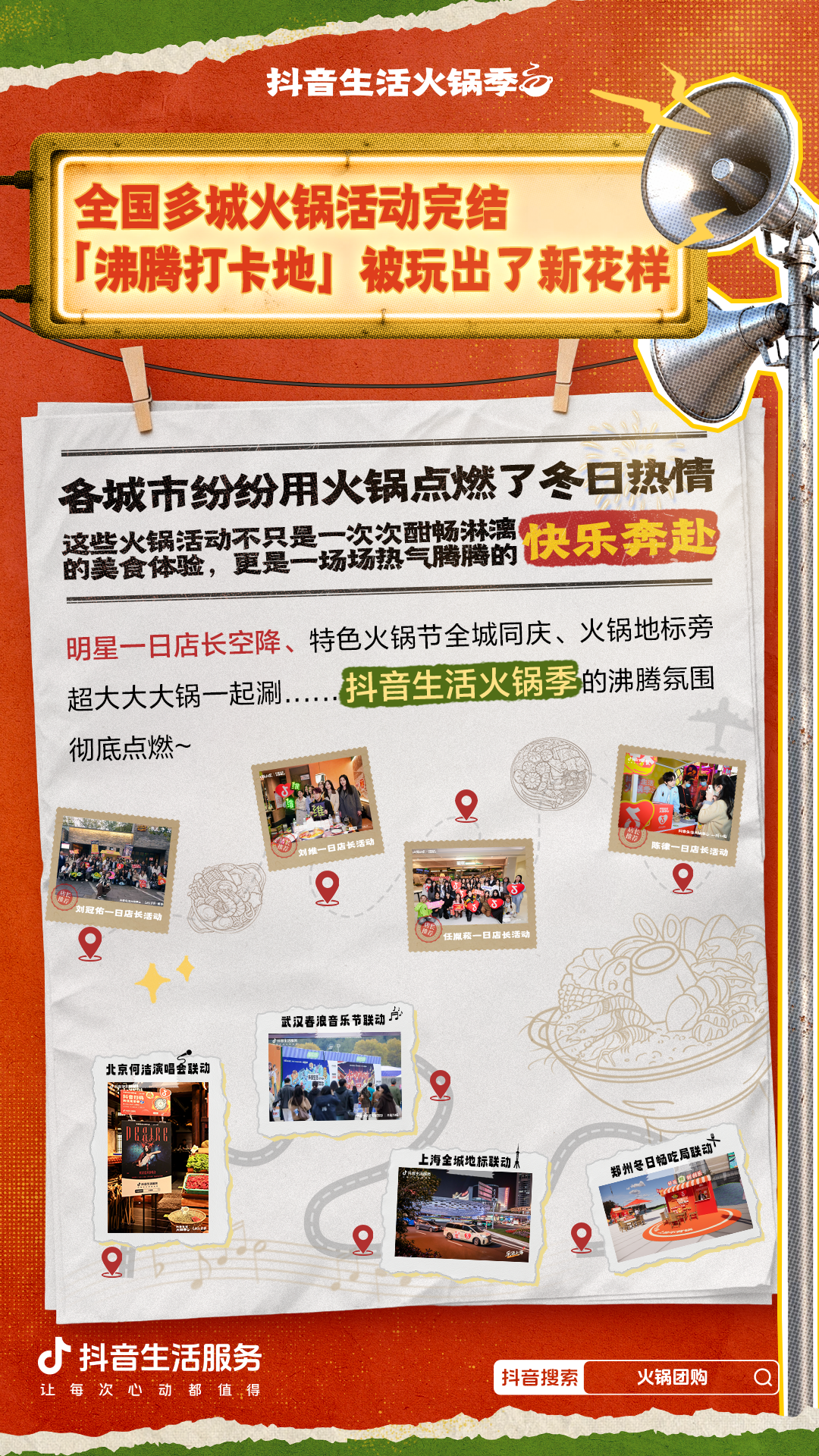 活动期间,「抖音生活火锅季」联动大牌火锅商家在全国多地打造大型火锅局,「沸腾合火人」们也跟着「多城沸腾」火锅图鉴打卡,收获了一整个冬天的快乐。在北京、济南等城市,刘冠佑、刘维等明星「一日店长」跟大家亲切互动;在郑州,「冬日畅吃火锅局」用超大火锅请大家免费开涮;在清远,加菲猫 IP 带大家吃遍全城火锅……随着一场场活动精彩落幕,越来越多人体验到了「火锅社交」的独特魅力,大家也在不同的火锅用餐场景里,把冬日生活过得更精彩。