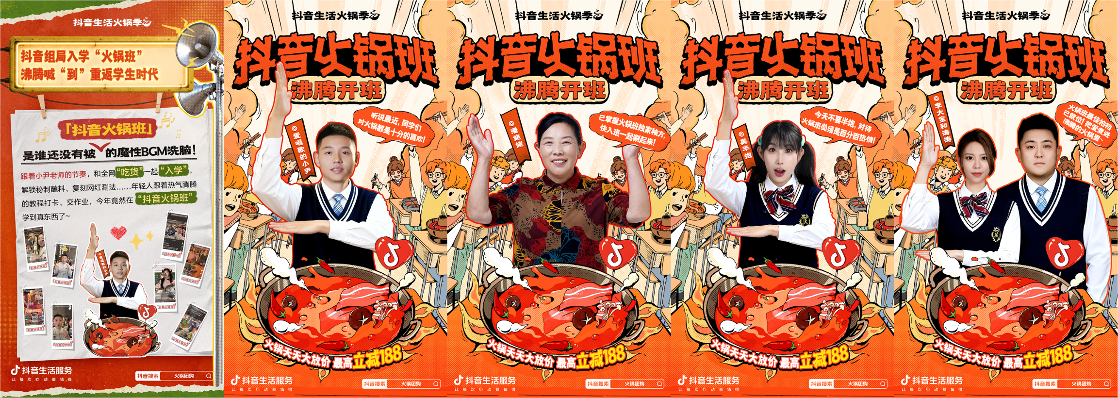 随着越来越多人加入「续火锅」的阵营,借着抖音音乐班的热度,活动特邀小尹老师共同发起「抖音火锅班」,带各位火锅脑袋一起「入班」开发新吃法。不光火锅界「学院派」的新东方烹饪学校师生积极响应,头部达人们也火力全开,@潘姥姥 @叶欣壹 @五个门牙 @胖阿胖仙子 等纷纷开启「整活」模式,用火锅版社恐挑战、蘸料 PK 大赛等把火锅吃出了新花样。相关视频发布后,#抖音火锅班沸腾开班 等话题登上抖音热点榜前列,评论区满是「现在就想出门去同款火锅店」的期待。