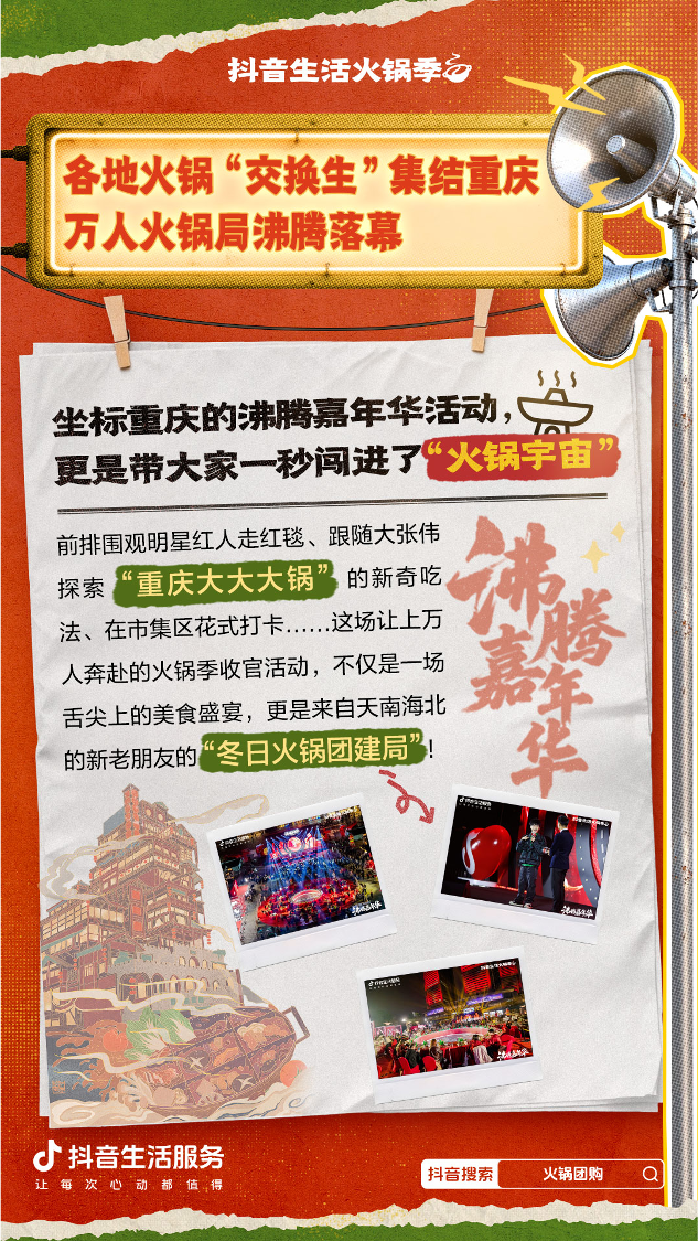 未来,抖音生活服务还会带大家继续解锁更多新鲜好玩的吃喝玩乐新方式。现在打开抖音搜索#火锅团购 ,依然可以跟着明星达人的火锅攻略,打卡同款好店,发现更多「对味」的火锅之选。后续抖音生活服务还会有更多惊喜活动与大家见面,敬请期待!