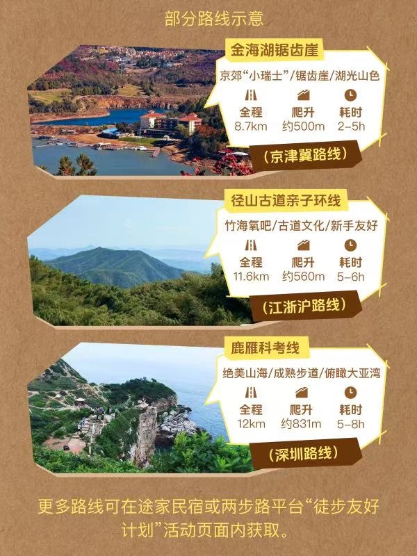 上述19条线路涵盖京津冀的金海湖、麻田岭,江浙沪的余杭径山古道、安山古道,以及深圳周边的鹿雁科考线等。这些线路均为当下秋冬季节的人气徒步路线,难度从徒步新手到资深驴友均可选择,适合在节假日约上三五好友,登高出游、亲近自然。