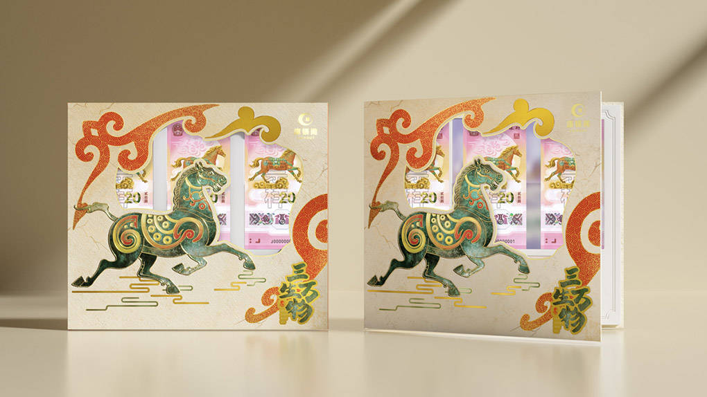 文化赋能是本次新品的核心亮点。《战马 五虎龙骧》的卡币设计基于历史名著《三国志》刘备及其五虎上将的战马,寓意“战马贺岁,福运登门!”,同时创新性融入景泰蓝珐琅彩画非遗技艺,将刘备“的卢”战马以立体珐琅彩形式呈现于卡币之上,经多层釉彩填绘与反复窑烧,实现传统工艺与国币的跨界对话,50:1的盲盒收藏比例更添探索乐趣。《天马瑰宝》取材《山海经》神瑞天马形象,采用传统吉祥色光明砂色为主调,“币钞证一体”的装帧形式兼具防伪性与收藏性,传递平步青云的新春祝愿。《三生万物》则以《道德经》哲学思想为内核,结合东汉“马踏飞燕”青铜艺术元素,将“天地人和”的传统文化智慧融入设计,彰显生生不息的吉祥寓意。