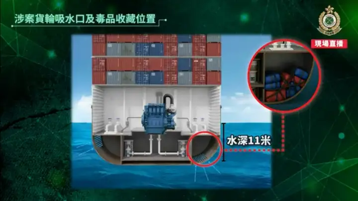 犯罪集团将417公斤可卡因用防水材料包裹,绑上5-10公斤的铅块,精心藏匿在水深约11米的船舶吸水口闸门处。香港海关毒品调查科高级监督刘玉龙在案件通报会上表示,这是海关首次发现有犯罪集团使用如此隐蔽的手法藏匿毒品。