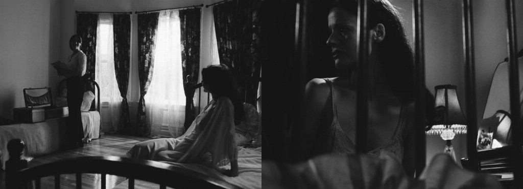 《Minotaur》则将这种判断推向另一个方向。影片以 1946 年洛杉矶为背景,置于黑色电影的视觉传统之中,围绕一桩与“黑色大丽花事件”呼应的女性命运展开。故事发生在一间寄宿公寓的卧室内,两名彼此陌生的年轻女性被迫共享这一空间。空间不再通过色彩变化传递情绪,而是借助构图、遮挡与距离,持续介入人物之间的关系。床栏、门框与前景物件反复切割画面,使人物始终处于被分隔、彼此无法真正接近的位置中。房间不再是中性的生活场所,而成为一种无法回避的存在,限制视线与行动,放大人物之间的紧张与不安。