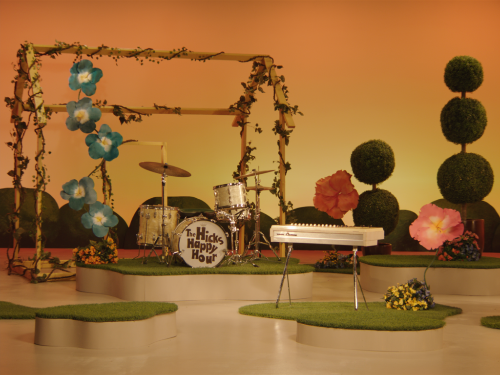 在实际工作中,这种判断最直接地体现在她参与的短片《The Hicks Happy Hour》中。影片设定在 1972 年洛杉矶一档家庭综艺节目的季终录制之夜。在舞台灯光亮起、音乐准时响起的时刻,父亲缺席,留在台前的只有母亲 Jill 和她的三个孩子,而表演仍必须继续。