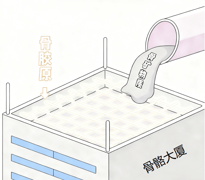 简单来说,骨胶原就像一张带有生物磁力的立体支架,能主动吸引血液中的钙离子,引导其有序沉积并转化为坚硬的钙盐结晶,牢牢附着于胶原纤维之上。这个过程,犹如在钢筋框架上浇筑混凝土,最终形成稳固统一的整体。如果没有骨胶原,补充的钙质就如同散沙,难以有效构建骨骼。