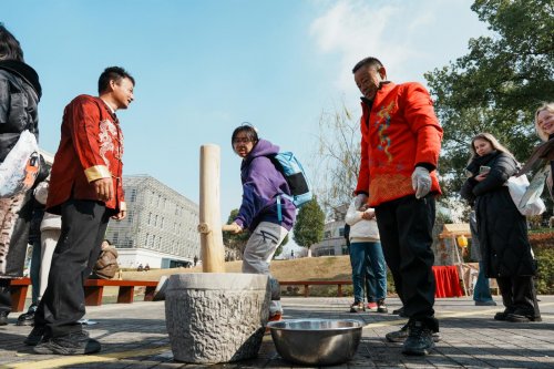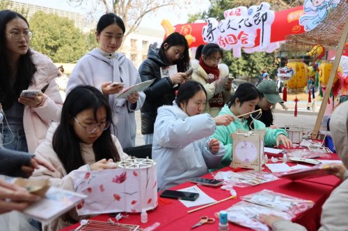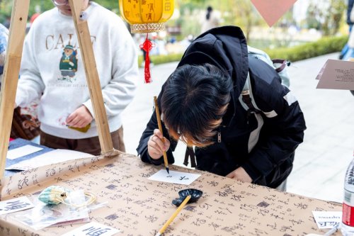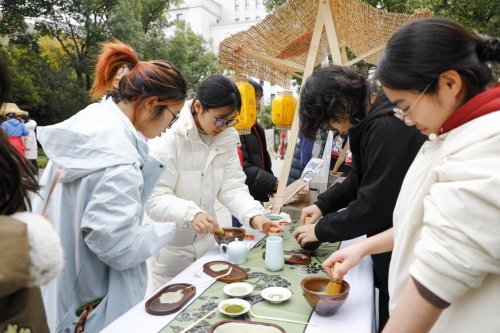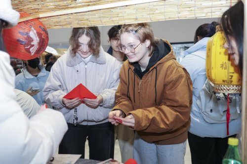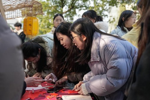 文旅学院校友朱丹携家乡竹子承办“跳竹竿”互动区,她说:“能带着乡土文化回校传承,倍感荣光。”在英文学院的拓印摊位前,摊主徐点点正忙着指导体验学生操作,“拓印让大家把中国纹样、中国祝福‘攥’在手里,也让留学生把这份‘中国祝福’带回自己的国家。”一张张印有祥云、福字、瑞兽的拓片,成为连接中外文化的温暖信物。艺术学院的书画与剪纸摊位同样热闹。摊主丰丝雨表示,在交流中她发现,很多国家也有类似剪纸的传统工艺,这种跨越文化的共鸣特别奇妙。
