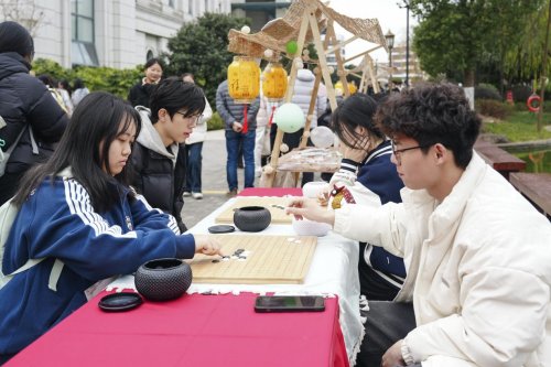 游园会现场氛围热烈,非遗工坊区人头攒动。市级非遗传承人现场教学“深澳彩灯”“兰溪面塑”,“击拂分茶”“拓印古碑”“手捏面人”“糖画”等十余项非遗体验项目吸引师生踊跃参与。师生们亲手体验打糍粑、编彩灯、串糖葫芦等传统活动,在烟火气中感受中华文化的温度与魅力。