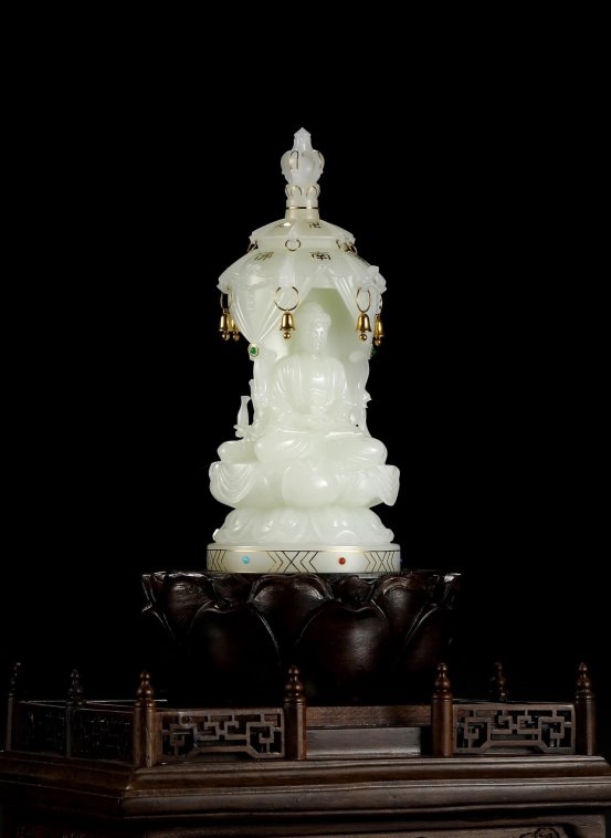 从浮雕到线雕,从圆雕到透雕,林少江精通多种玉雕技法,却始终秉持“随物赋形、随形赋彩”的创作理念。一块翡翠原料的色泽、纹理、瑕疵,在他眼中皆是天然的灵感,他会根据玉料的天然特质量身定制创作主题,让人工之巧与自然之美浑然天成。其代表作《自在观音》,巧用翡翠的冰种飘绿勾勒观音的衣袂飘带,温润的玉质与慈悲的神态相得益彰,尽显“玉必有工,工必有意,意必吉祥”的传统精髓;《江南水乡》则以浅浮雕技法雕琢出水乡的小桥流水、粉墙黛瓦,将江南的婉约诗意凝于玉上,让人观之如临其境。