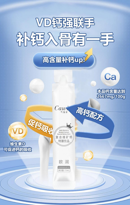 时代生物备受关注的创新产品中,尤为引人注目的当属“液体钙复合维生素特膳饮品”。这款产品以“液态营养·特膳配方·丝滑不卡喉”为核心特点。在产品配方上,我们坚持“精准营养,科学复配”理念,每袋“液体钙”含有400mg进口有机钙,科学配比维生素D3和复合营养素,形成了小分子速吸收系统,易于肠道吸收,大幅度提升钙的吸收利用率。同时,产品复配多种维生素和矿物质,实现了营养的全面协同,真正做到了“1支>3支”的高效营养补充。风味创新,乳酸菌口味的液体钙饮品完美优化了铁、锌、维生素的金属味或酸涩味,口感细腻丝滑,尽享味觉盛宴,为打造爆品注入创新活力。