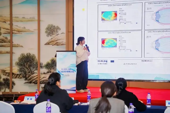 宁波爱尔眼科翁佳伟在《量变与质变》中,从持续管理的角度阐释规范随访、数据积累对近视防控效果的长期意义;嘉兴爱尔眼科刘悦以《思问配镜案例分享》为切入点,强调在验配过程中“多问一步、多看一层”的临床思维对方案优化的重要价值;象山爱尔眼科翁静在《从“移”到“定”,从“涨”到“停——一例角膜塑形镜换片带来的眼轴控制逆转》中,生动呈现了通过科学换片实现眼轴增长有效控制的实践成果;杭州爱尔眼科王晶则通过《一例青少年近视框架防控方案的优化转换》,展示了在不同阶段灵活调整防控策略的临床逻辑;宁波爱尔门诊陈冰冰在《破“镜”增优——OK 镜验配案例》中,分享了复杂条件下 OK 镜验配突破与视觉质量提升的经验。