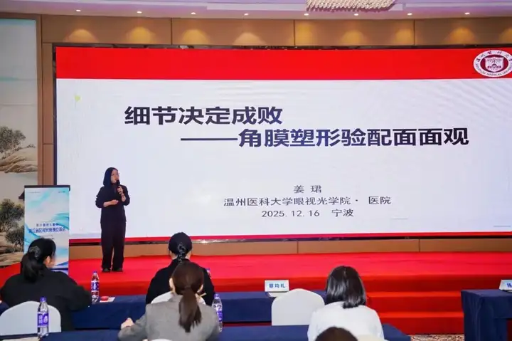 在专题分享环节,温州医科大学眼视光学院·医院姜珺主任带来《细节决定成败——角膜塑形验配面面观》的课程,从临床实操出发,系统梳理角膜塑形镜验配过程中容易被忽视的关键细节,强调标准化流程与个体化判断并重的重要性。