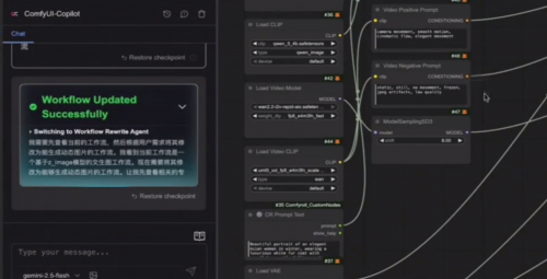 • 工作流改写:自动调优,化繁为简 这是Agent最具“智慧”的体现。当创作者需要调整参数或扩展功能时,只需输入想法,Agent会分析当前链路,自动完成参数修改和节点部署,不再需要繁琐的手动部署。