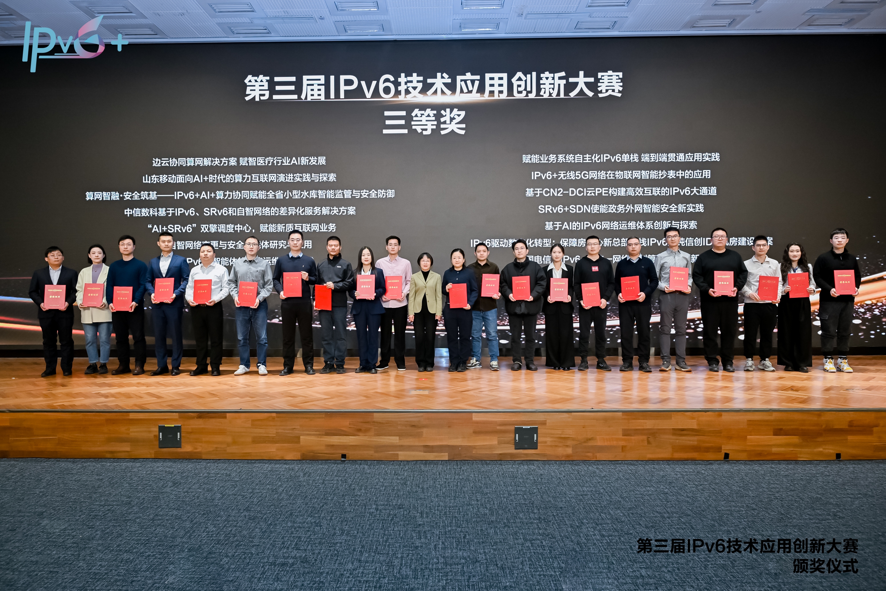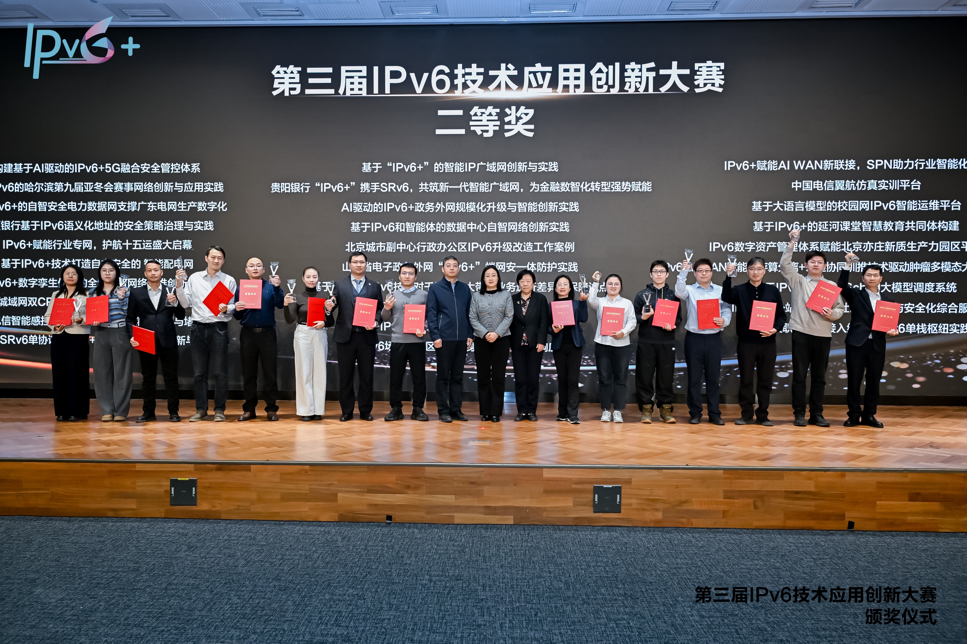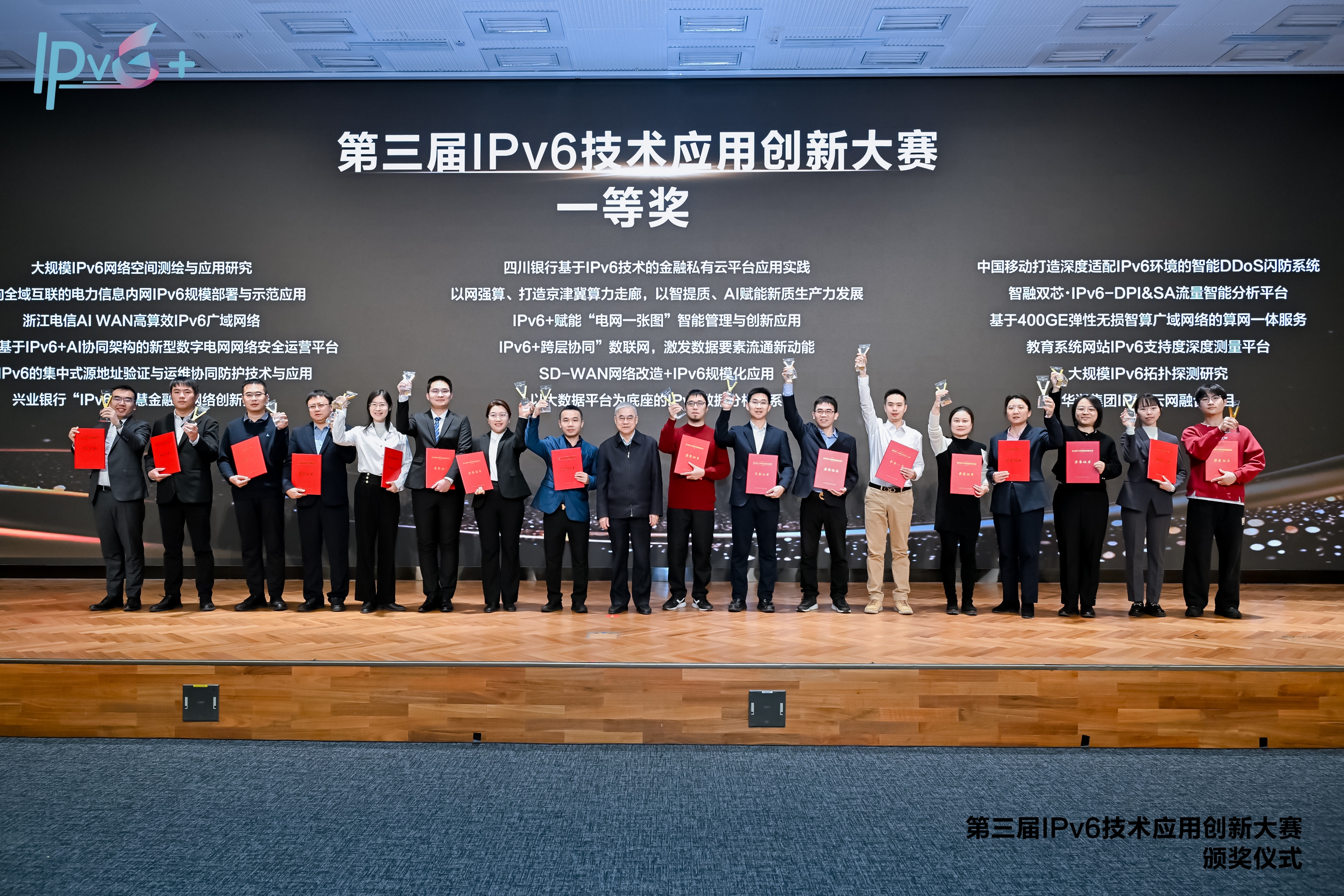 2025年12月27日,第三届“IPv6技术应用创新大赛”总决赛颁奖仪式在北京举行。本届大赛以“深融共进 智启新篇”为主题,由中国信息通信研究院、中国通信标准化协会联合主办,中国信息通信研究院、中国电机工程学会、中国教育和科研计算机网CERNET网络中心、常州大学等单位分别主办了强基、电力、科教、油气、金融、AI WAN、自智网络等7个专题赛,本次大赛还设置了北京、湖南2个区域赛。