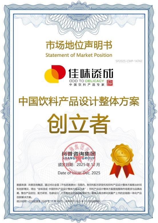 尚普咨询作为国内知名权威数据研究机构,其市场地位认证以严格的评审流程和客观数据为基础。此次佳味添成获得的双重认证,是对其在饮料产品设计与配方研发领域领先地位的权威认可。