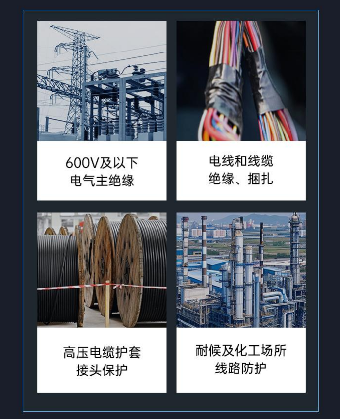 优异的绝缘防护离不开紧密贴合的包裹。J93全天候电气胶带具备良好的拉伸回弹性是普通胶带1.5倍;良好的从形性,可均匀拉伸并紧密包裹在不同形状、尺寸的电缆接头、母线或线束上,自动回弹产生持续紧绷力,消除气泡与褶皱。这不仅提供出色的机械保护与防潮密封性,也使施工更加便捷、外观更为整齐。配合 “半重叠绕包” 等规范施工方法,可构建无缝隙的绝缘保护层。