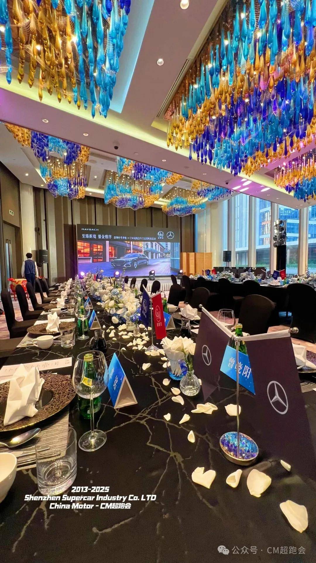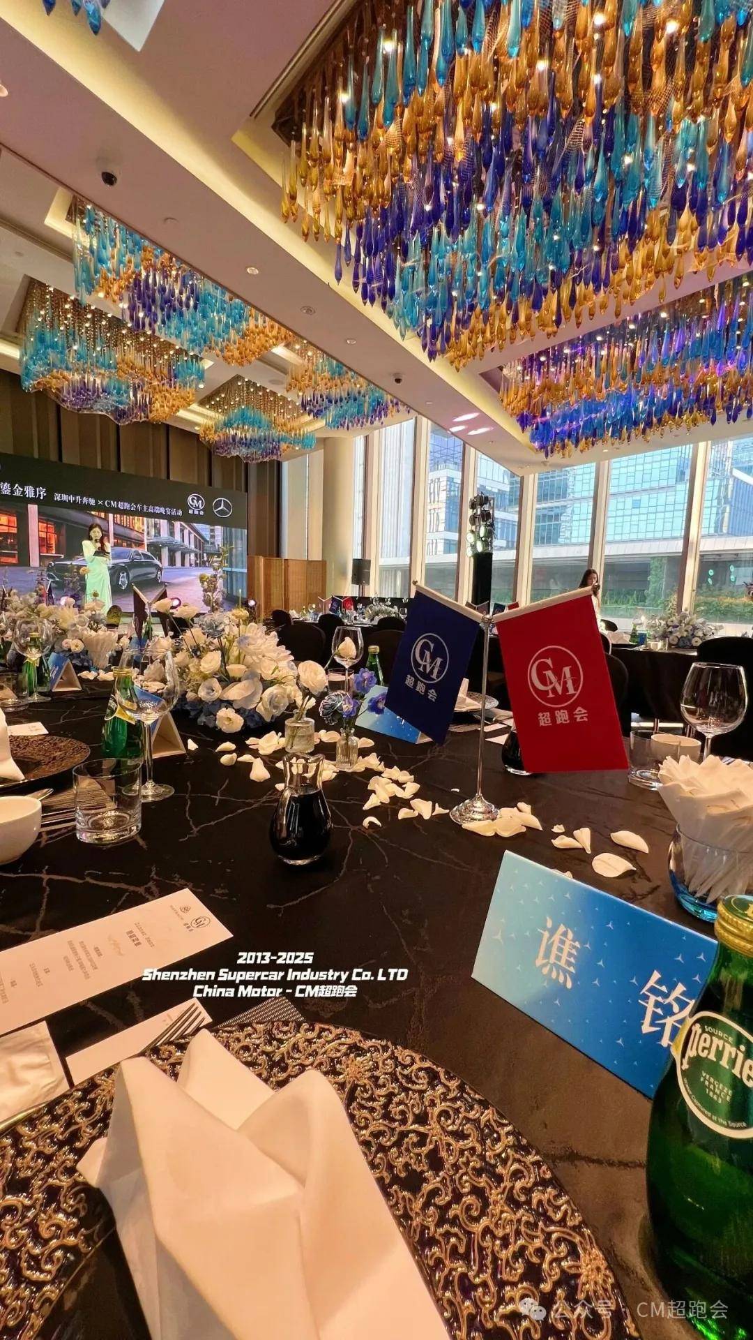 作为CM超跑会今年最具影响力的活动之一,本次晚宴投入超百万,从场地布置到节目编排均体现了顶级水准。深湾汇的宴会厅以“未来赛道”为主题,LED屏实时显示AMG车型的动态数据,餐桌设计融入超跑元素,连餐具都定制了AMG和CM超跑会标识。CM超跑会希望通过这样的活动,让更多人感受到超跑文化的魅力。