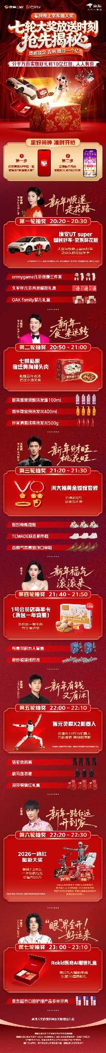 活动期间,消费者打开京东APP参与“跨晚”互动,即有机会获得搭载京东鲜花的埃安UT super国民好车、七鲜私厨宿迁黄狗猪头肉、智元灵犀X2机器人、承包全年可生食鸡蛋的1号会员店尊享卡、周大福黄金婚嫁套装等豪华大奖,更有涵盖了2026元京东超市卡、9999元京东健康卡、奥佳华Ten+4.0按摩椅、TCL98Q10L电视、京喜2026件鸿运套装、斯波兹曼新国标电动车、智元远征A2机器人在内的“2026一路红”超级大奖,让你“打包”带回家。