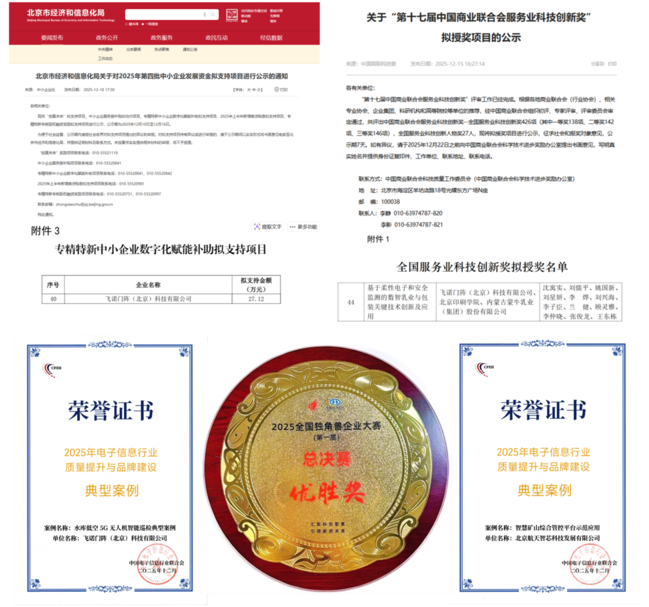 12月15日,第十七届中国商业联合会服务业科技创新奖名单正式揭晓,飞诺门阵与北京印刷学院、蒙牛集团共同申报的“基于柔性电子和安全监测的数智乳业与包装关键技术创新及应用”项目荣获“服务业科技创新三等奖”。中国商业联合会服务业科技创新奖是经国家科技部、国家科学技术奖励工作办公室批准设立的权威奖项,代表了我国商业服务领域科技创新的高水平成果。该项目通过柔性电子传感与实时安全监测技术,结合物联网与人工智能分析平台,构建了贯穿乳制品生产、包装、流通全链条的数字化质量管控体系,展现了飞诺在柔性电子、安全检测、产业数字化交叉领域的创新能力和产业实践。此外,在14日于盐城举办的2025电子信息行业发展大会上,飞诺水库低空5G无人机智能巡检和智慧矿山综合管控平台示范应用两项案例,入选“2025年电子信息行业质量提升与品牌建设典型案例”。2025年以来,飞诺门阵持续获得政府专项重大支持:从“海淀区中小企业高价值专利培育布局专项”,到国家级重点“小巨人”企业高质量发展奖补资金,再到入选北京市经信局数字化赋能补助专项等奖项,彰显了飞诺创新驱动和产研突破的清晰发展路径。