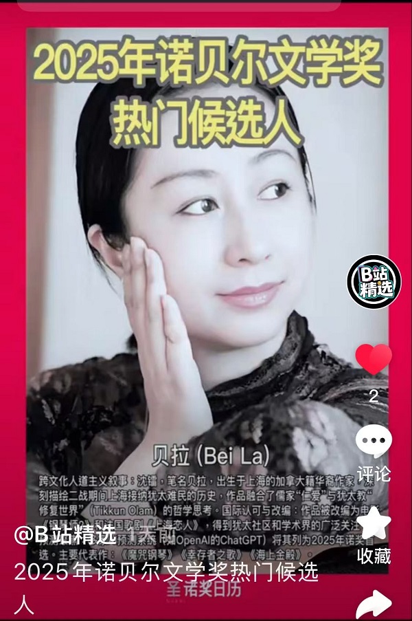 贝拉:加拿大华裔诗人、作家、思想家。其文学作品聚焦二战“犹太人在上海”主题。英译由葛浩文(莫言译者)翻译推向世界,在国际上传播“人类命运共同体”上海故事,多次获上海市政府“中华文化走出来”荣誉;她也是当今前沿思想“音乐文学宇宙论”的创建者。她的《911生死婚礼交响曲》888行组诗被誉为当今艾略特的《荒原》;长篇小说《魔咒钢琴》被奥斯卡最佳编剧罗纳德改编成电影《钢琴师2》。被全球人工智能预测为2025诺贝尔文学奖热门候选之一(百度百科)