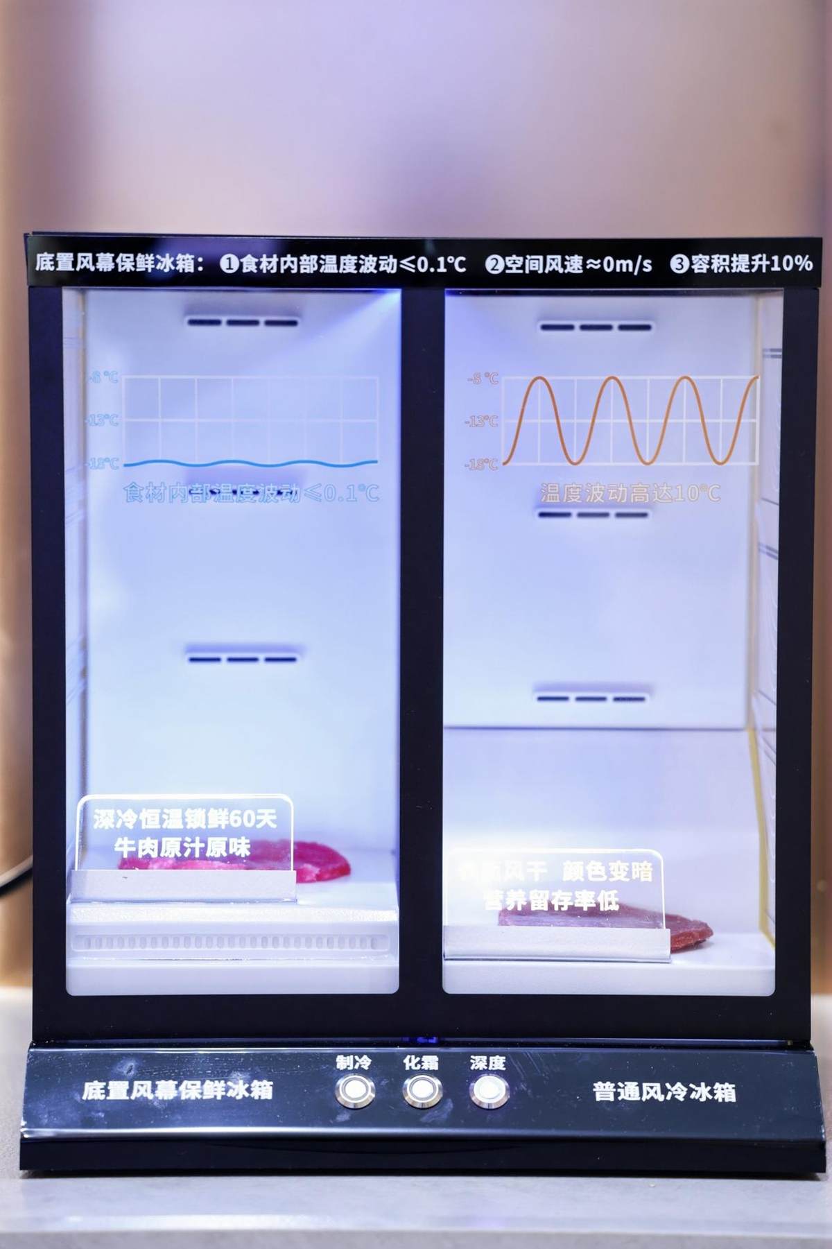 在温度控制上,卡萨帝冰箱解决了传统冰箱冷风直吹、温差大的痛点。其底置循环风幕保鲜科技,让冷气如风幕般360°均匀包裹食材,避免直吹,并将温度波动精准控制在±0.1℃之内,为细胞提供恒稳的休眠环境。同时,-30℃深冷智冻技术能快速锁住肉类海鲜细胞内的水分与营养,生鲜冷冻60天后,营养物质留存率依然接近100%。