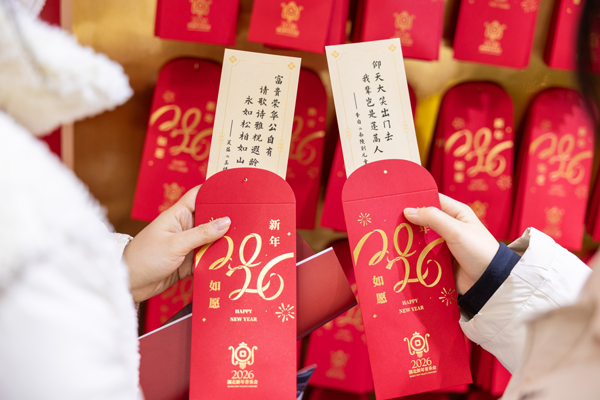 为让音乐会更添新春氛围与互动趣味,场馆入口处设置的“2026新年如愿祝福墙”与“新年如愿打卡红包墙”,成为中国银行湖北省分行助力打造的保留互动环节。观众凭票抽取印有古诗文句的祝福红包,“少年负壮气,奋烈自有时”“笑指松椿,当是同年”等古典雅致的祝愿,既为新年注入温暖期许,也让艺术盛宴多了几分烟火温情。