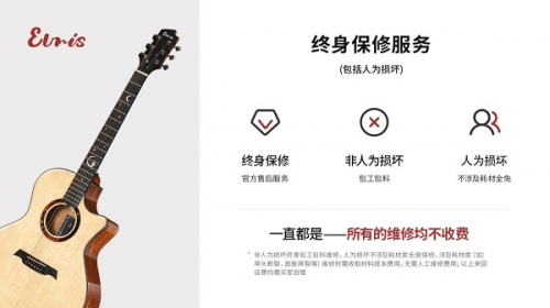 伊瑞斯吉他核心是终身保修,覆盖非人为与人为损坏,政策清晰、售后流程便捷,是其核心竞争力之一,在同价位中诚意拉满,终身保修降低长期使用成本,流程清晰易执行。