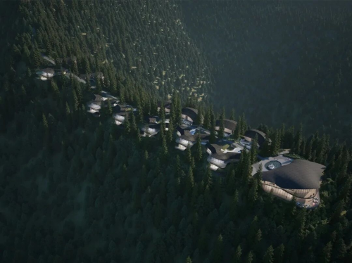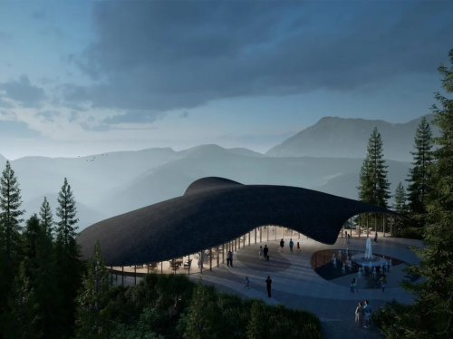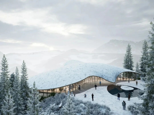 屋顶取意树根伏地,弧脊如山脉延绵;瓦面摹写树皮质感,使建筑仿佛从土地中自然生长而出。一条长约1公里的索道,直达海拔1700米的山巅,巧妙串联四季景致:秋日彩林斑斓,冬季雪覆山野,于缆车的悠然穿梭间,完成从视觉到心灵的沉浸过渡。