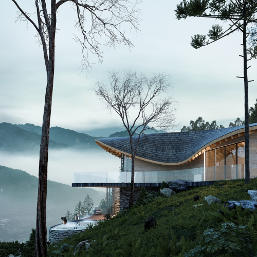 本项目以“远离尘世、回归自然”为核心理念,从本土建筑肌理中汲取灵感,融合木、石、夯土、瓦与清水混凝土等天然材料,运用简洁克制的设计语言,构建出与地形、植被深度交融的建筑形态。