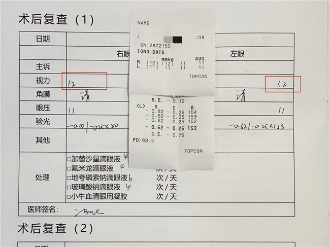 手术最终在张海燕主任及其团队的紧密协作下顺利完成。术后第一天复查,谢女士双眼视力均恢复到1.2的清晰水平,远超其术前戴镜的最佳矫正视力。她高兴地说:“没想到我这个年纪还能做手术,而且效果这么好!现在看东西都特别清楚。”